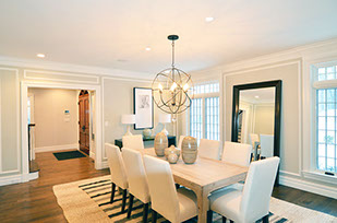 The dining room has plenty of seating and a beautiful overhead fixture.