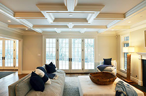 The family room has French doors or windows on two sides.