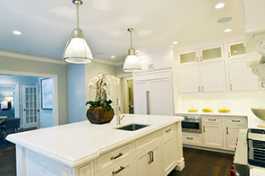 Island seats 4 on a side as a breakfast bar. Windows provide plenty of natural light.