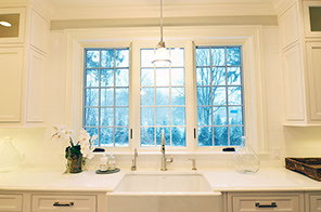 Kitchen sink by the windows with overhead light fixture.